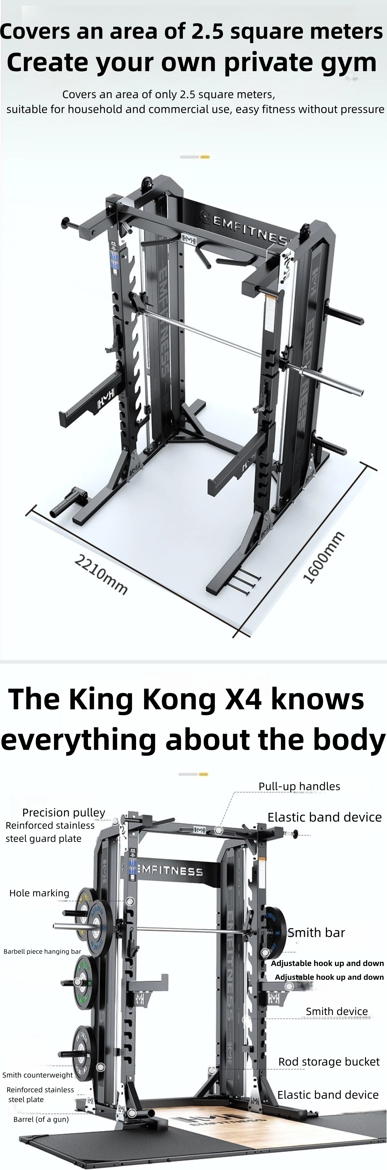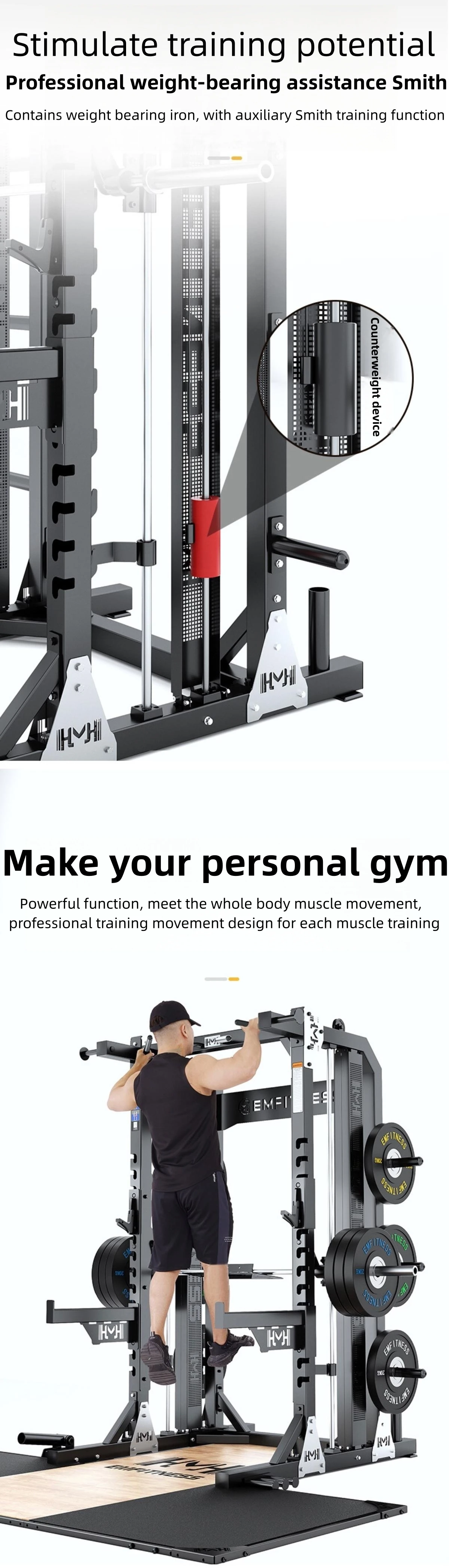 | Max Load Capacity | 400 kg (Smith Bar), 120 kg (Cable System) |