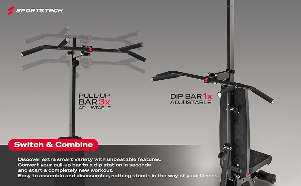 ✅𝗠𝗨𝗟𝗧𝗜𝗙𝗨𝗡𝗖𝗧𝗜𝗢𝗡𝗔𝗟: It’s all in the combo! An infinite number of different training combinations and the 3 levels – flat, incline and decline – make the fitness bench the perfect strength station. Train your back, abdomen, chest, shoulders and legs easily with just one piece of fitness equipment. With an adaptive pull-up bar and the dip station, you can also do pull-ups and dips and make your workout more versatile than EVER before!